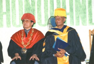 Sri Chinmoy (rechts) bei der Verleihung der Ehrendoktorwürde