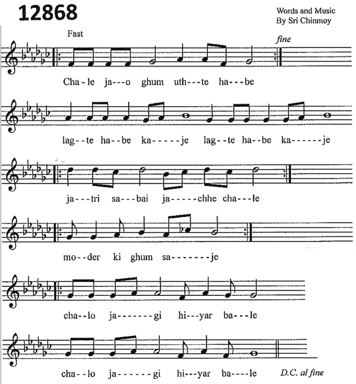 Translation: ‘Beyond joy and sorrow I shall now go; after centuries of longing for You, I shall receive you’ (Unofficial translation by Sri Chinmoy’s students)