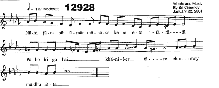 Translation: ‘Alas, I do not know why inside my mind there is so much meanness and baseness; Alas, how will I recieve, even for a fleeting second, the divine sweet consciousness?’ (Unofficial translation by Sri Chinmoy’s students)