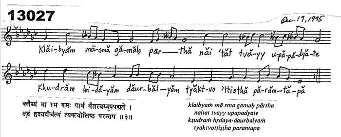 A Sanskrit extract (sloka) from the Bhagavad Gita, India’s sacred text, where Lord Krishna tells Arjuna, his beloved disciple, to arise and fight in life’s battlefield.