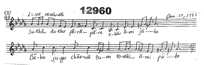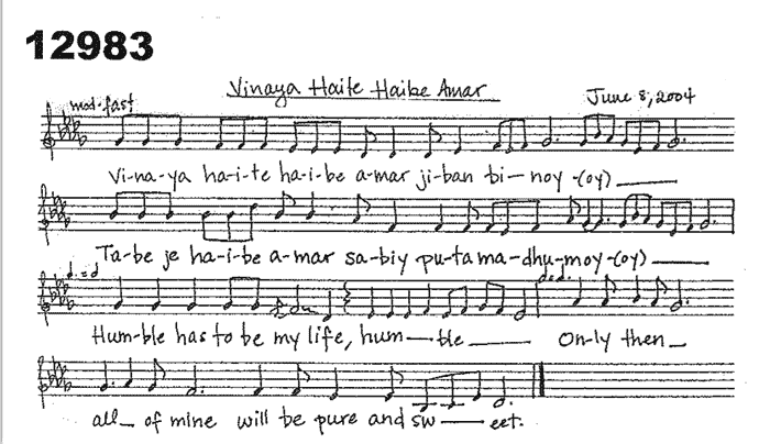 The eight sessions usually consist of 5 sessions of Bengali songs, and 3 sessions of mostly English songs. These particular songs (12821-13060, according to the the group’s own internal numbering system) were sung between 27 December 2017 and 3 January 2018, during our year-end Christmas Trip. The song scores below are among the songs that were sung during these performances.
