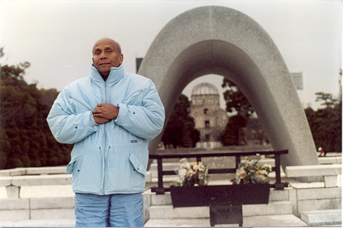 Sri Chinmoy meditating at the site of the atomic bomb blast in Hiroshima.