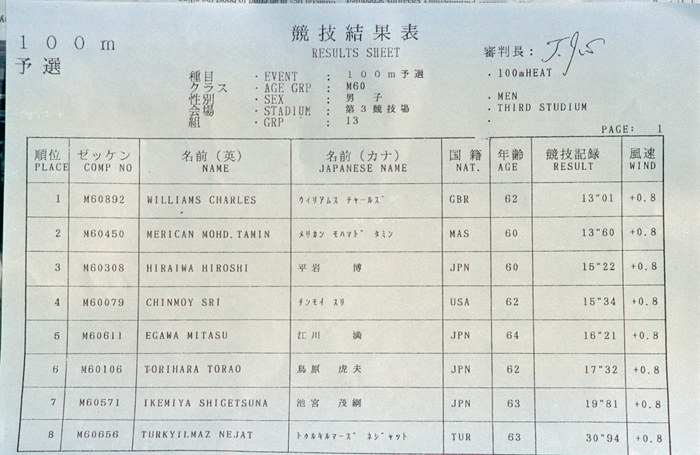 At the age of 62, he still officially took part in the World Veteran’s Championship in Miyazaki, Southern Japan, October 1993. Participating in the opening ceremony, Sri Chinmoy marched past within the U.S. delegation, and he ran 100 meter sprint (15.34 electronic timing). His race number was 79, and he ran in lane 6, using starting blocks. There were 8 participants in Sri Chinmoy’s heat, and he placed 4th. There were 103 competitors altogether in the 60-64 age category.