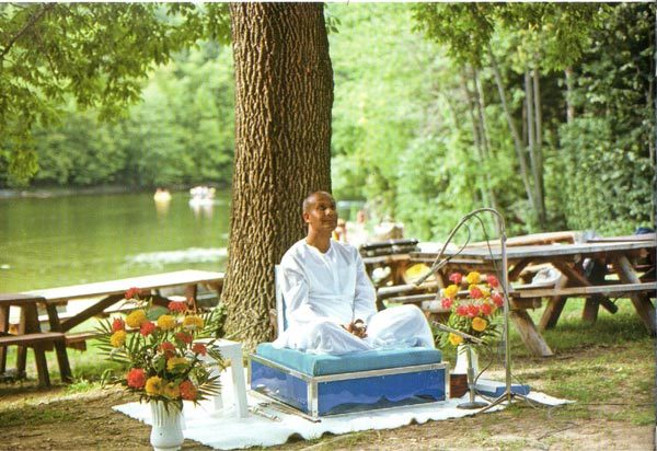 Sri Chinmoy meditates at Hidden Valley Park, near Woodstock, 23 July 1977.