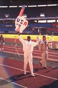 Later on the same day, Sri Chinmoy received from Sudhahota Carl Lewis his victory-bouquet following his gold medal in the 100 metres during the Olympic Ceremony.