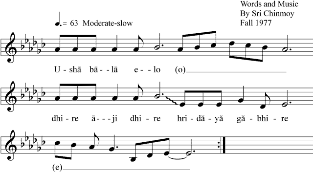 The music scores for these songs can be found at Sri Chinmoy Songs by searching for the song title, for example.
