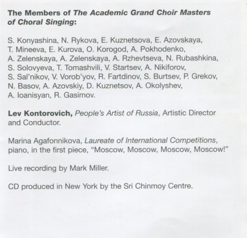 A recording of Sri Chinmoy’s songs, arranged by Valery Piankov and performed in Moscow by the Academic Grand Choir Masters of Choral Singing, conducted by Lev Kontorovich